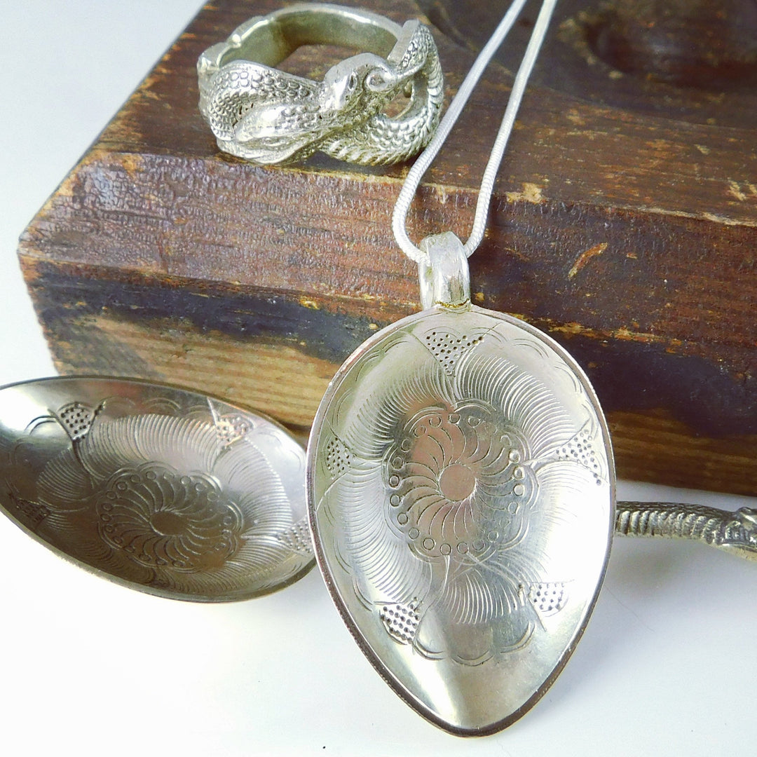 The Plum Blossom Silverware Jewelry collection pieces are made from rare, antique Asian silver souvenir spoons. Nearly all of the spoons feature a large decorative plum blossom in the center of the bowl of the spoon. The spoon handles end in sculptural finnials depicting dragons, serpents and other east Asian symbols.